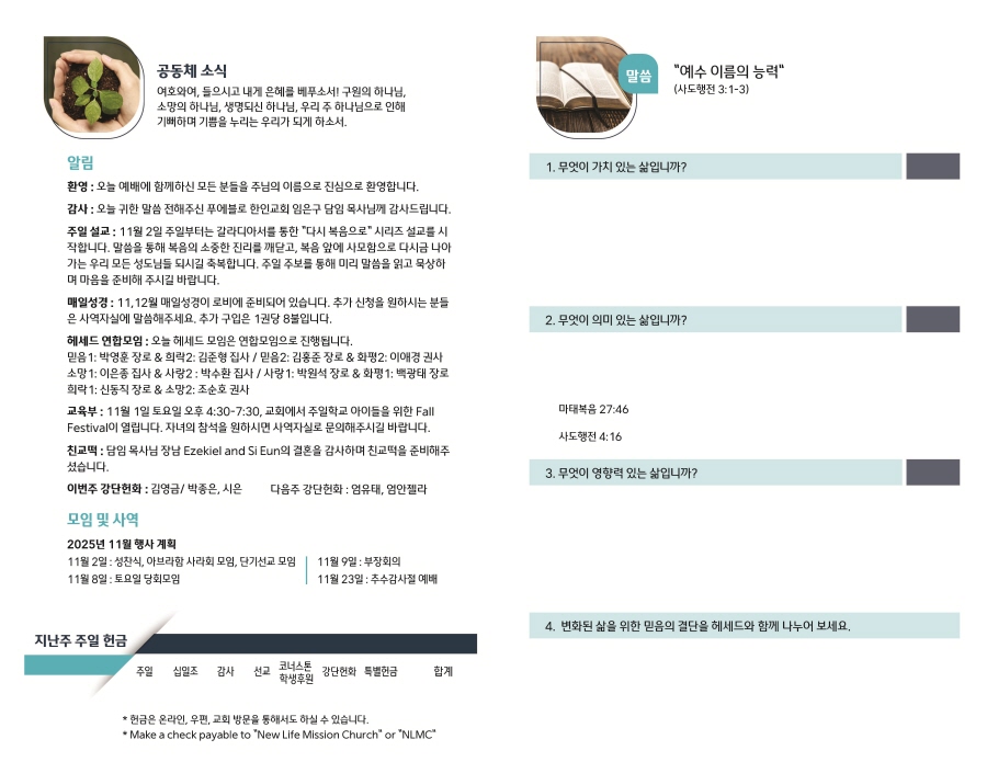 주보 2025년 10월 26일 주보 Publish on October 25,2025 | NLMC 페이지 정보 작성자 NLMC 댓글 0건 조회 12회 작성일 25-10-25 08:43 목록 본문 주보 다음글2025년 10월 19일 주보 25.10.18 댓글 0 댓글목록 등록된 댓글이 없습니다. 목록