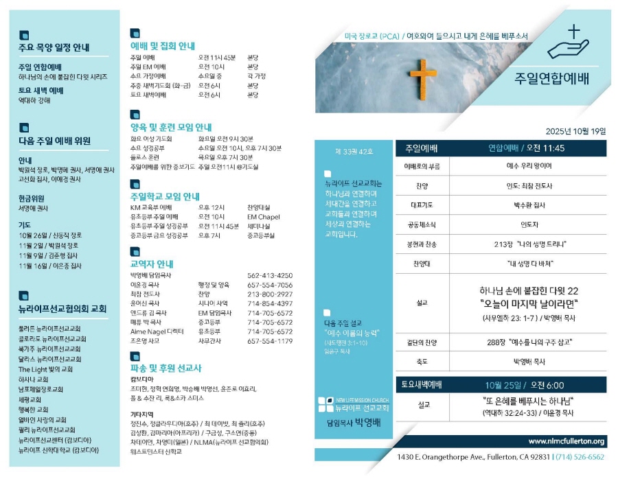 주보 2025년 10월 19일 주보 Publish on October 18,2025 | NLMC 페이지 정보 작성자 NLMC 댓글 0건 조회 102회 작성일 25-10-18 12:01 목록 본문 주보 다음글2025년 10월 12일 주보 25.10.12 댓글 0 댓글목록 등록된 댓글이 없습니다. 목록
